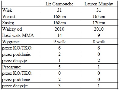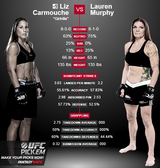 Carmouche walczy z odwrotnej pozycji, przeważnie trzyma ręce wysoko, stara się unikać ciosów. Często korzysta z niskich kopnięć, dysponuje przyzwoitą siłą ciosu. Jej główną siłą są obalenia i obijanie z góry, pomaga jej w tym duża siła fizyczna. Murphy wstępowała w szeregi zawodników UFC będąc mistrzynią organizacji Invicta FC. Jest zawodniczką, którą ciężko szczególnie wyróżnić za jakiś aspekt walki. Podobnie jak najbliższa rywalka preferuje obalenia i kontrolę z góry. Wytypowanie zwycięzcy tej walki nie jest proste, moim zdaniem to Liz wyjdzie z tego pojedynku z tarczą. Myślę, że to jej zapasy w połączeniu z siłą fizyczną zadecydują o wyniku walki.