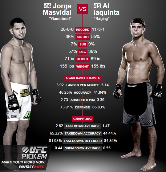 Stójka. Obaj zawodnicy walczą z klasycznej pozycji i mają dużo do zaoferowania w płaszczyźnie kickbokserskiej. Masvidal znakomicie korzysta ze swoich pięści i dużego zasięgu ramion. Ma twardą szczękę, często uderza na korpus, dobrze unika ciosów (gif.1.) i nie zapomina o kopnięciach (gif.2.) i uderzeniach kolanami (gif.3.). Czasem jednak jest zbyt pasywny w swoich działaniach. Podopieczny Raya Longo i Matta Serry również umie robić użytek ze swoich pięści i łokci (gif.4. gif.5.), w stójce jest uważny, stara się nie ryzykować, unika także bezmyślnych szarż. Bardzo chętnie odwołuje się do ciosów na korpus często celując w wątrobę oponenta. Iaquinta nie może się także wstydzić swoich technik kopanych, dobrze używa low-kicków a także wysokich kopnięć. W porównaniu do Jorge Al z reguły utrzymuje wysoką aktywność w walce.