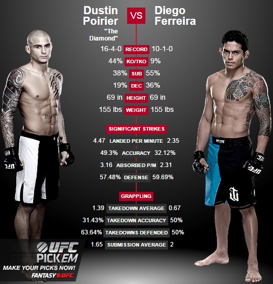 Amerykanin jest zawodnikiem 4 lata młodszym od swojego rywala, Diament ma obecnie 26 lat. Zawodową karierę wcześniej zaczął Dustin, który walczy od 2009r., ma na koncie 20 walk z czego 16 wygrał w 13 kończąc rywali przed czasem. Brazylijczyk startuje od 2011r. i do tej pory stoczył 12 walk, tylko 1 raz przegrał.